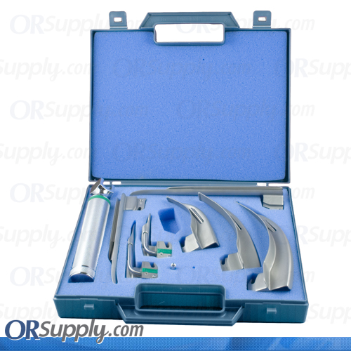 Fiber Optic Set Includes: Medium Handle, extra lamp, English MacIntosh Blades Size: 2, 3, 4, Miller Blades Size: 0, 1, 2, 3, & case.