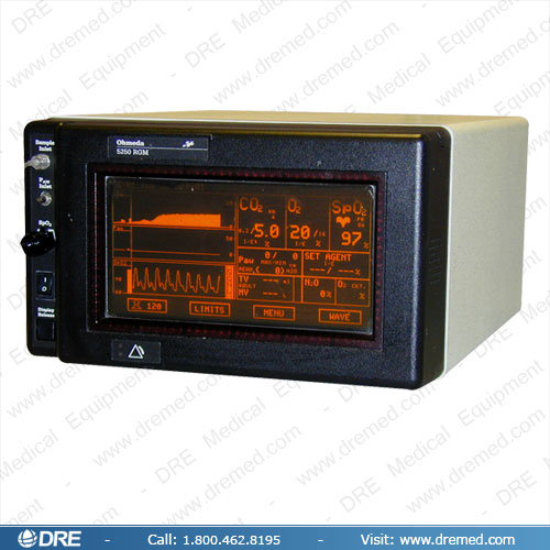El monitor de CO2 Ohmeda 5250 tiene análisis opcional de SaO2 o un agente 3/5. Los datos están visualizados numéricamente o en grafica (con forma de onda). Alarmas audibles y visuales son estándares. Los 5250 están disponibles remanufacturados por DRE.