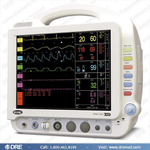 El Monitor DRE Spectra AG5. Dos monitores en uno.DRE introduce el monitor de multi-uso Spectra AG5. Combina todas las características de un monitor de paciente multípara metro con los beneficios añadidos de un monitor de agente anestésico. Tiene pantalla plana, grande a color (12.2 pulgadas diagonales) de alta definición, y esta disponible con las siguientes configuraciones:
