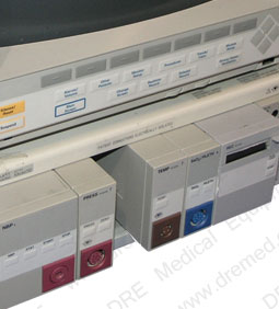 Disponible profesionalmente acondicionado por parte de DRE. El monitor Merlín de Hewlett Packard (Merlin HP) es un monitor modular para paciente con conexión de red y capacidades de manejo de información. El Merlín HP puede ser configurado para medir ECG, Respiración, NIBP, Presión Arterial Invasiva, Pulsioximetría (SpO2), Gasto Cardiaco, Temperatura, Presión Parcial de CO2 Final Expirada (ETCO2) ó Grabadora (impresora)