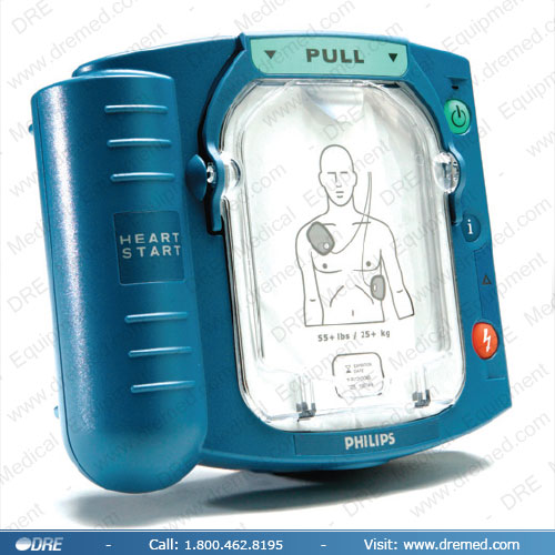 Philips HeartStart biphasic AED (Desfibrilador Automático Externo) puede ser usado sobre pacientes de cualquier edad, con uso pedatrico o almohadillas de defibrillation de adulto. El HeartStart tiene un cartucho de almohadilla de educación opcional entonces el personal puede practicar sus habilidades AED yfamiliarisarse con la unidad. El Philips AED automáticamente prueba todas las partes, incluso almohadillas disponibles, diariamente. El HeartStart pesa 3.3 libras con la batería / 2.4 libras sin.