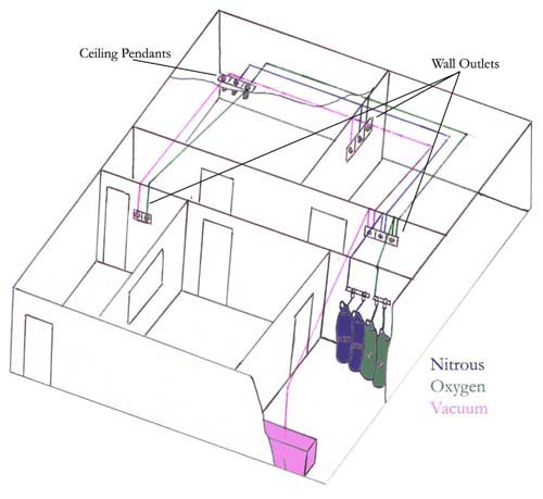 Los interfaces de bomba con un sistema de fontanería (proporcionado por un profesional contratado). La Bomba Neumática constantemente regula la presión de vacío en el sistema. Este proporciona el nivel apropiado del vacío a las Salidas de Vacío en cualquier momento. La bomba es puesta la talla proporcionalmente al número de salidas de vacío dentro de la clínica (por lo general basado sobre el metraje cuadrado).