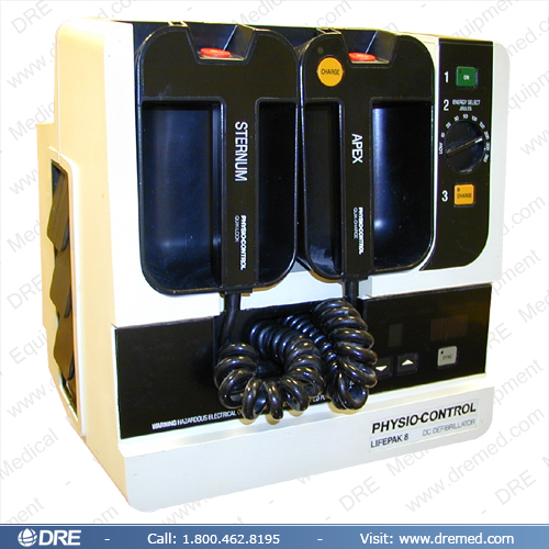 El Control de Physio Lifepak 8 tiene la demanda o la no demanda que marca el paso (opcional) y la calidad diagnóstica ECG que registra (monitor embargable no mostrado). Batería o poder de corriente alterna. Encuentra estándares de ACLS corrientes. 3 o 5 plomo para entrada de ECG. Alarmas de precio de corazón.